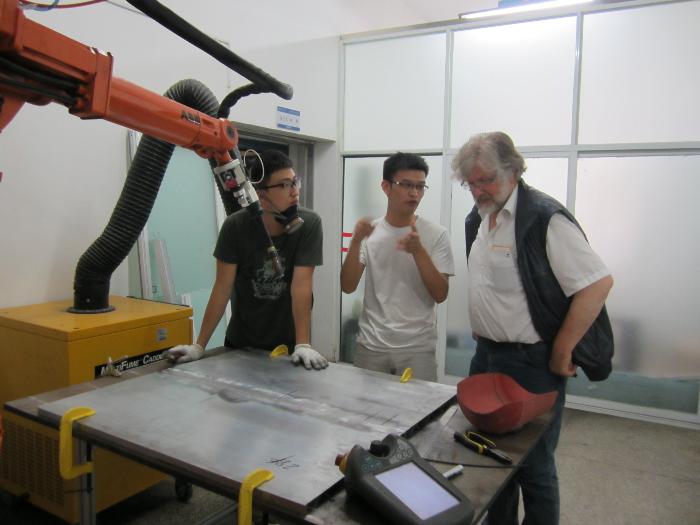 焊接实验室,并与师生们一起用汉诺威分析仪对机器人焊接进行了质量检测和分析。