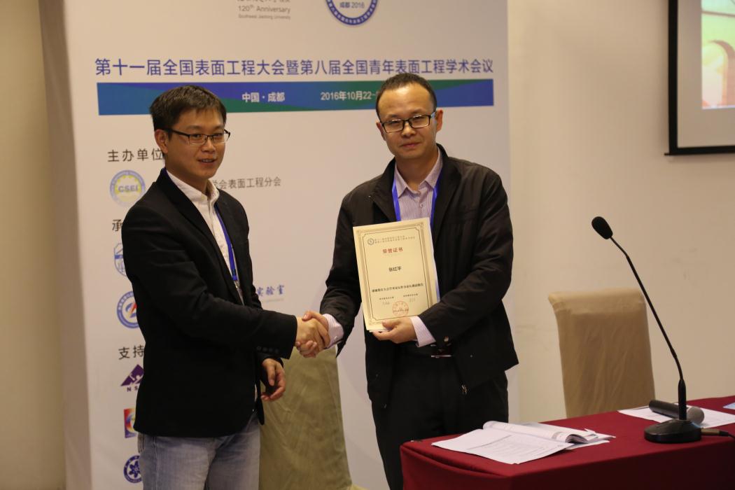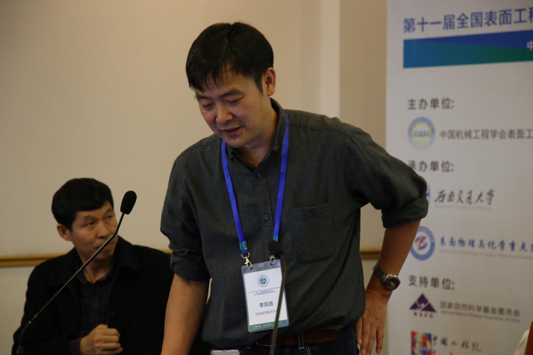 的郑靖教授主持。会议时间为14:00-18:20,期间分别由李刘合、宋浩杰、王志强、朱旻昊、姜超、范云鹰、卫明等人做会议报告。报告内容为《带状真空电弧磁过滤器制备类金刚石薄膜研究》、《易合成有改进摩擦学性能的铜/聚多巴胺功能化氧化石墨烯的纳米复合材料》、《高速接触网吊弦的弯曲微动疲劳试验研究》、《镀锌层硅酸盐蓝白钝化工艺的研究及提高耐蚀性的探索》。