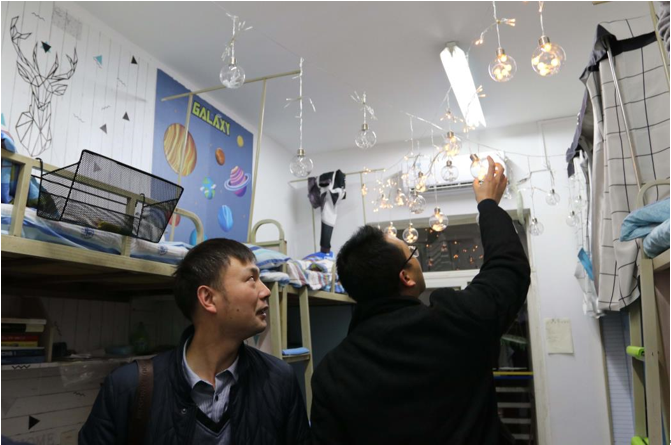 贺剑副书记(主持工作)与章春军副书记欣赏男生宿舍精心布置的吊灯