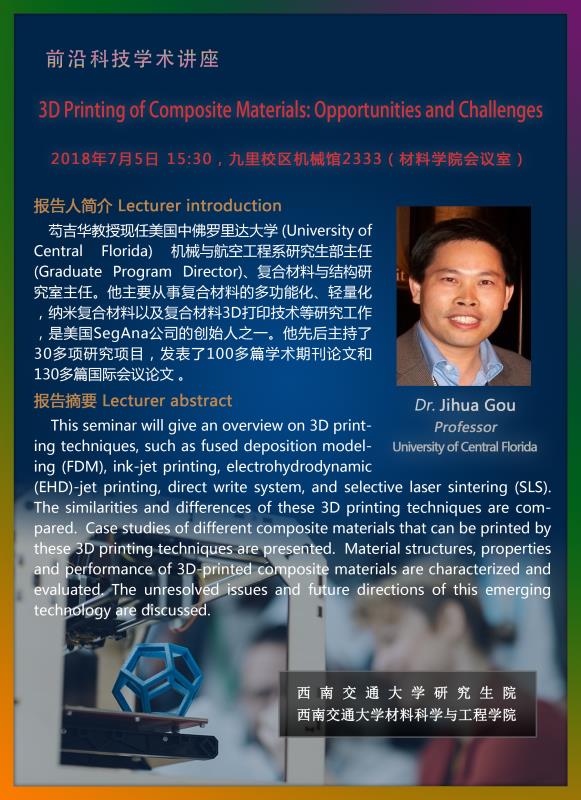 芶吉华教授现任美国中佛罗里达大学 (University of Central Florida) 机械与航空工程系研究生部主任(Graduate Program Director)、复合材料与结构研究室主任。他主要从事复合材料的多功能化、轻量化,纳米复合材料以及复合材料3D打印技术等研究工作,是美国SegAna公司的创始人之一。他先后主持了30多项研究项目,发表了100多篇学术期刊论文和130多篇国际会议论文 。