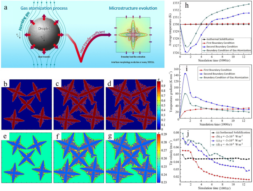 为了提高粉末的品质、收得率以及附加值,探索气雾化传热过程与微观组织形貌之间的演变关系。探究粉末在气雾化快速凝固过程中的热量传递,并将该过程中的传热系数与微观组织模拟的相场法相结合,通过模拟得到微观组织形貌演变规律,从而有利于实现合金粉末微观组织及形貌调控,最终实现3D打印合金粉末制备工艺优化以及高品质合金粉末的制备。