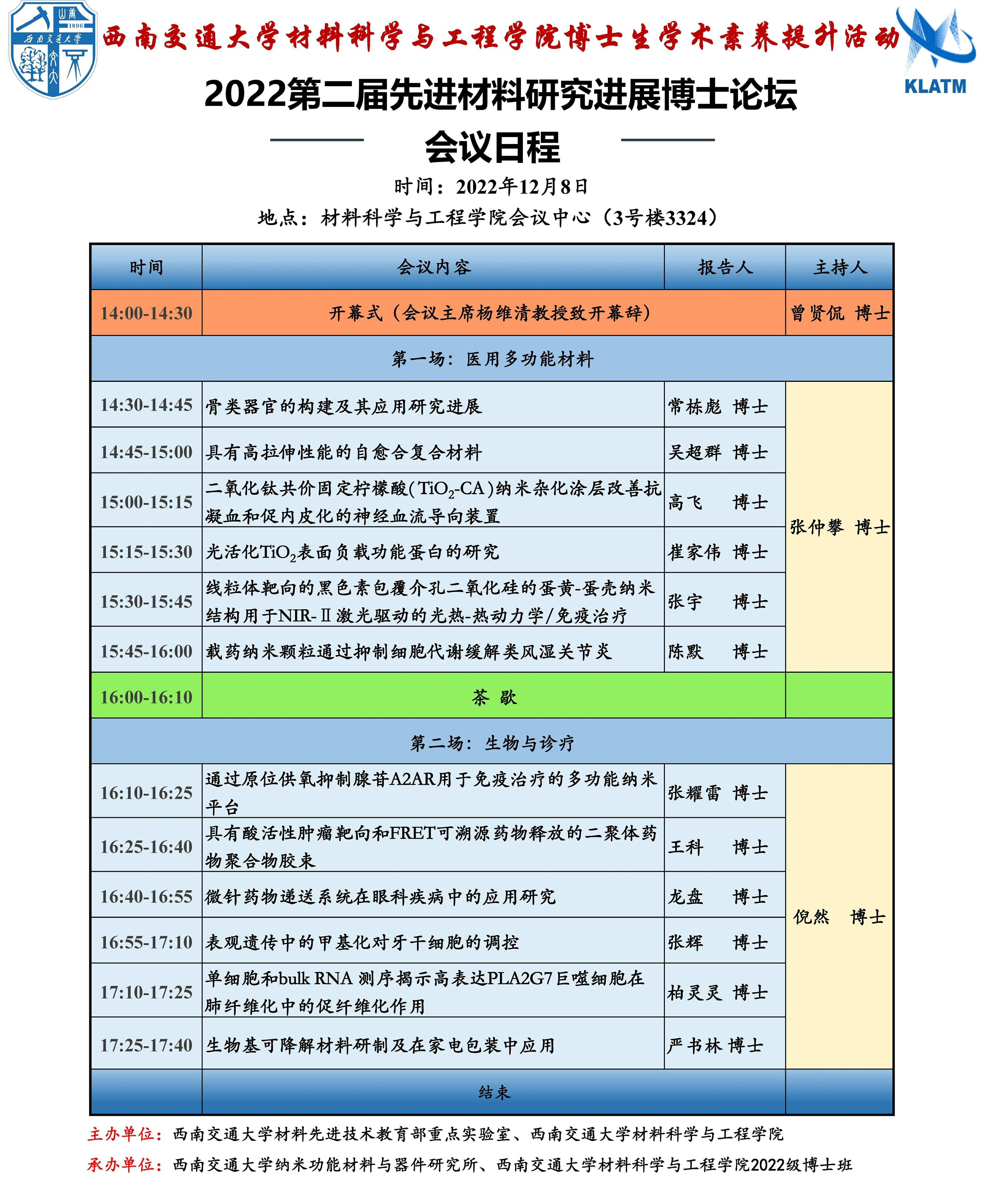2022级博士研究生进行主题报告,报告将围绕医用多功能材料,生物与诊疗,金属功能材料,光、电催化材料,能源及薄膜材料,凝胶材料及传感器多方面的学科前沿交叉问题展开,旨在促进材料科学学科发展、合作与创新,激发思想碰撞和产学研合作,拓宽色情文学