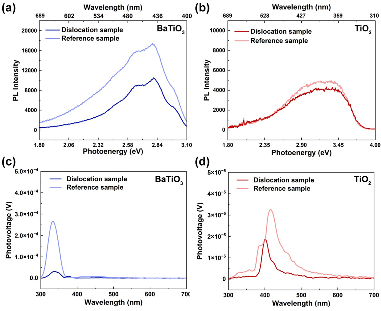 在此次研究中,合作研究团队通过在高温下施加单轴压缩载荷,成功向钛酸钡和二氧化钛块状单晶中引入了主要沿 <001> 和 <100> 取向的位错。实验发现两种金属氧化物的光学性能未明显受到位错的影响。但位错的引入增强了二者的载流子分离/转移能力,有效地抑制了光生电子-空穴对的复合。位错作为光生电子从光催化剂内部到表面迁移的快速通道,本质上提高了光催化剂表面上的光生电子的数量,从而加强了电子主导的光催化反应。因此,这些富含位错的钛酸钡和二氧化钛单晶样品比没有位错的样品具有更强的光催化过氧化氢合成能力。尽管没有牺牲剂的加入,二者的过氧化氢的产率甚至超过了已报道的研究中的多种方法。该研究为调控光催化剂中一维缺陷来促进光催化反应的相关研究开辟了新的途径,使位错工程成为一种颇具希望的可持续调控手段。