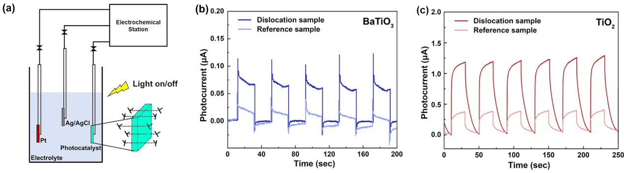 为此,李琦教授团队和德国达姆施塔特工业大学Jürgen Rödel教授团队展开了合作。合作研究团队在本工作中以两种块状金属氧化物单晶为研究对象,通过引入特定取向的位错来探索线缺陷对金属氧化物光催化性能的影响及其作用机理。研究发现通过高温变形引入的位错可以作为光生电子迁移的快速通道,从而提高了光催化剂表面上的光生电子的数量,这有利于电子主导的光催化反应。以光催化过氧化氢合成为基准反应,在无额外牺牲剂帮助的情况下,具有高位错密度的单晶金属氧化物相对于无位错样品实现了光催化过氧化氢合成产量的显著提高。目前相关研究以“Enhancing the photoelectric performance of metaloxide semiconductors by introduction of dislocations” 为题在线发表于国际期刊《Journal of Material Chemistry A》上。我院2022级博士研究生张皓宇为本文第一作者,李琦教授和达姆施塔特工业大学Till Frömling教授为共同通讯作者。