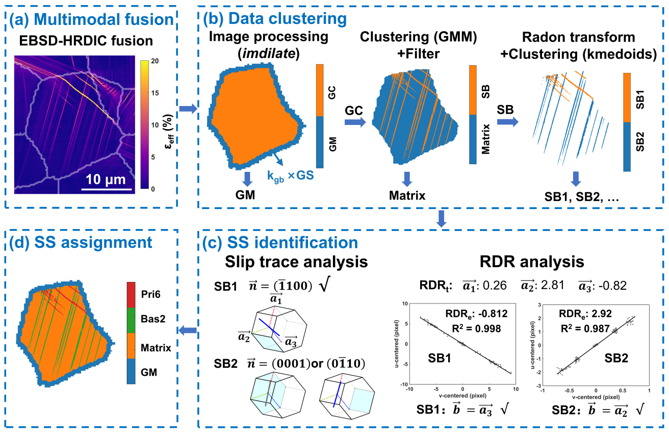 学界很早就认识到金属材料的塑性变形在各个尺度下都是高度局域化(不均匀)的,具体表现为大多数应变集中于滑移带、晶界、剪切带、变形孪晶内。这种应变局域化是影响材料强度及塑性的关键因素,因此受到广泛关注。但是,受限于实验和分析方法,对应变局域化的定量研究还极为欠缺。近些年来,得益于高分辨数字图像相关(high-resolution digital image correlation,HRDIC)技术的提出和发展,获得纳米级分辨率和大视场的全场应变成为可能。但是,HRDIC具有数据量大(通常包含数千万数据点)、信息丰富(包含的位移场、应变场、旋转场等)的特征,这使得手动分析耗时耗力甚至不可能,从而无法有效地利用HRDIC的海量信息。另一方面,多晶材料的塑性变形应包含互相协调竞争的晶内和晶间变形,但目前大多数的HRDIC研究都只关注前者,而忽略了后者。