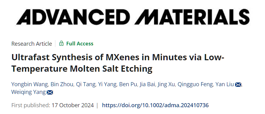 杨维清教授团队博士研究生王勇彬在材料学领域国际著名期刊《Advanced Materials》发表了题为“Ultrafast Synthesis of MXenes in Minutes via Low-Temperature Molten Salt Etching”的最新研究成果。《Advanced Materials》是世界上最负盛名的期刊之一,多年来在材料、化学、物理等学科领域位列TOP一区期刊,2024年度影响因子为27.6。该工作提出了一种全新的MXene低温熔融盐(LTMS)超快合成策略,实现了Ti3C2Tx MXene的分钟级快速制备,并成功将其推广至其他多种MXene的高效合成,为二维材料MXene的高效可扩展合成提供了行之有效的新思路。前沿科学研究院与色情文学