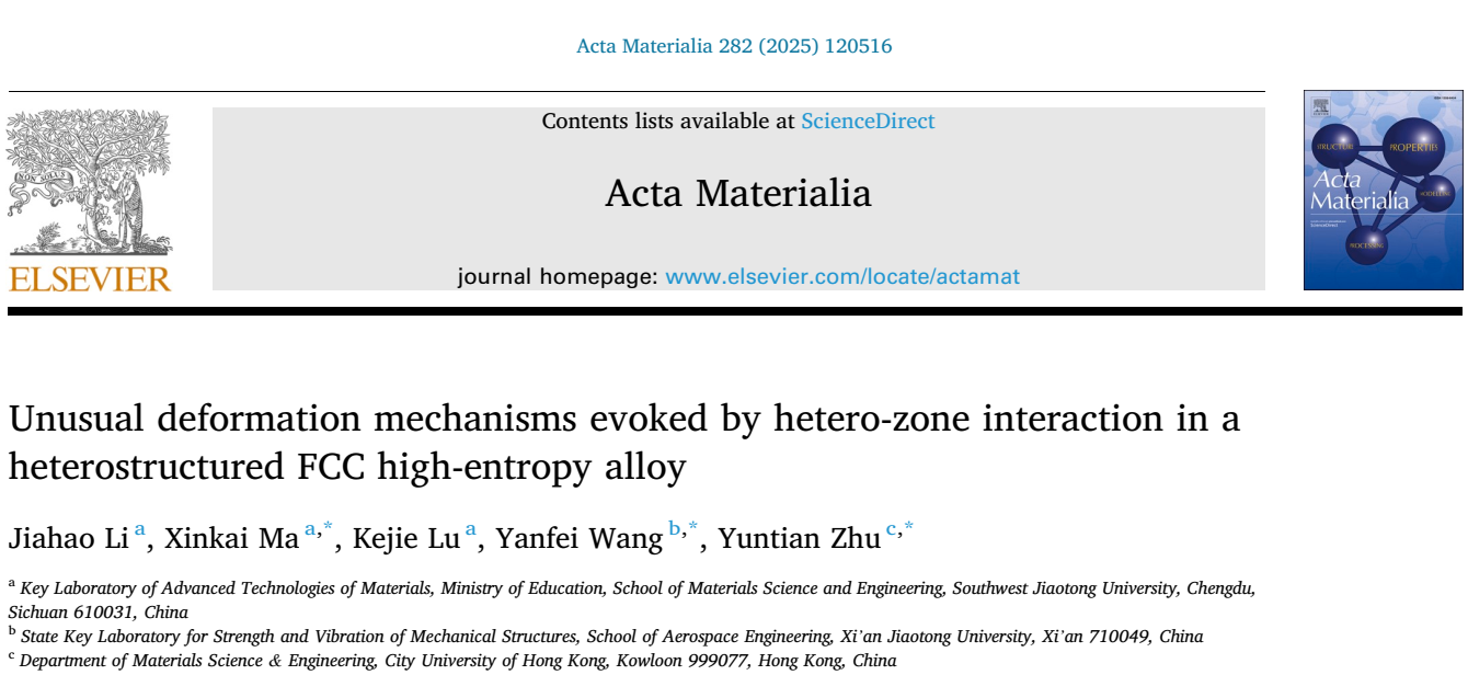 相关成果以“Unusual deformation mechanisms evoked by hetero-zone interaction in a heterostructured FCC high-entropy alloy”为题发表在工程技术-材料科学领域顶级期刊《Acta Materialia》上。论文的第一作者为色情文学