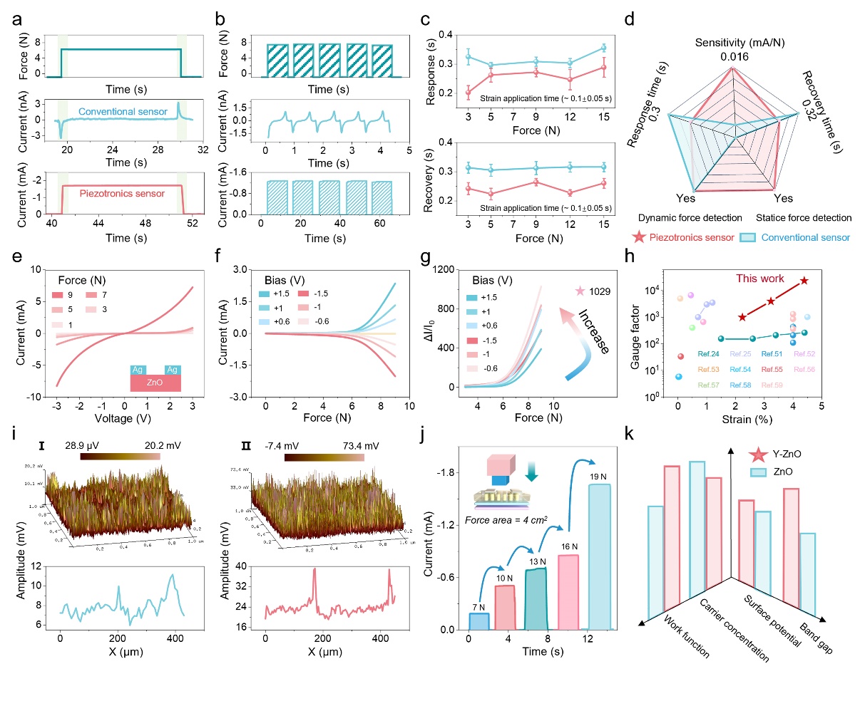 图3. 传统压电传感器和压电电子学传感器的比较在静态力(a)、动态力检测(b)和 响应/恢复时间(c)方面的比较。(d) 用于比较两种传感器之间不同性能的雷达图。(e) 在 -3 和 +3 V 之间的扫描偏压下,BPS的I-V 特性曲线随外力的改变而变化,(f) 在 -1.5、-1、-0.6、0、0.6、1 和 1.5 V 偏压下 BPS 的电流-压力关系。(g) 在不同正向和反向偏压条件下,BPS 的电流变化比与压力的关系。(h)本研究与一些现有的ZnO基传感器的增益因子比较。(i) ZnO 和 Y-ZnO 的 PFM 测试结果。 (j) 7~19N梯度静压下BPS的电流响应。(k) Y-ZnO与ZnO基本性质比较。
