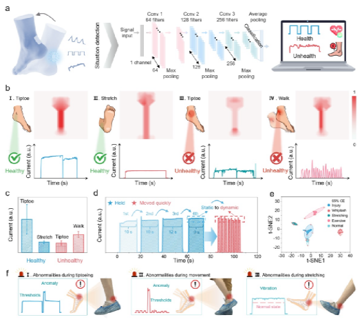 图4. (a) 用于捕捉各种姿势的部署在跟腱上的BPS的示意图、用于识别健康状态的所构建的1D-CNN模型的详细架构。(b) 4种跟腱行为的压力分布和相应的电流反应。(c) 4种跟腱行为的电流强度比较。(d) 跟腱康复训练期间动态和静态力的监测。(e) 采用t-SNE降维对深度学习后的输出数据进行可视化。(f) 跟腱运动的早期预警。