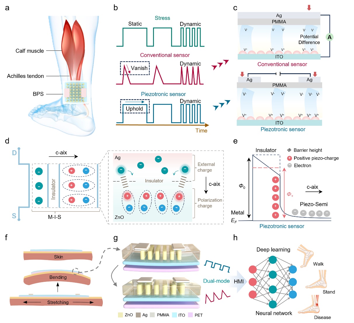 图1.BPS的设计理念与工作原理。(a)基于BPS的跟腱行为监测系统的示意图。(b)传统压电传感器无法检测到静态力,因为在保持外力时感应电荷会消散,而压电电子传感器可以检测静态力和动态力。(c) 传统压电传感器(顶部)和压电电子学传感器(底部)的结构比较。(d) BPS微观工作机制示意图。(e) BPS的金属/绝缘体/压电半导体结构示意图以及正压电电荷的相应传导能带分布。BPS附着在跟腱上,随着跟腱的运动而发生变形(f),ZnO纳米棒阵列也随之产生形变 (g),通过深度学习进行运动状态分析(h)。