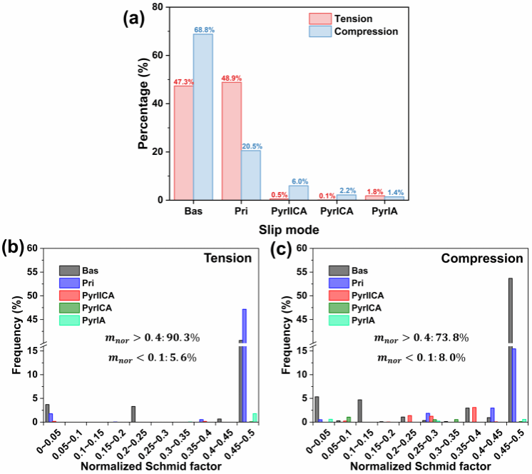 图4 滑移活性的TCA:(a) 拉伸与压缩状态下各滑移模式占比;(b)-(c) 拉伸与压缩状态下的归一化Schmid因子(mnor)分布。本统计采用基于像素的方法(考虑SB形貌),涉及超过200万个数据点。该图表明压缩状态下角锥面滑移占比(8.2%)显著高于拉伸状态(0.6%)。