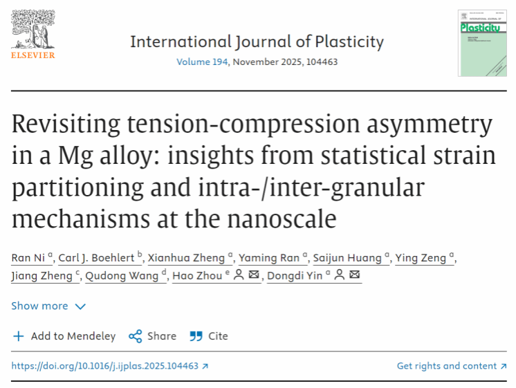 尹冬弟教授、博士生倪然,联合辽宁材料实验室周浩研究员等,基于自主开发的晶粒变形多模态自动分析框架(AutoGrainDAM),结合HRDIC与EBSD数据融合技术,突破了以往研究多孤立考察单一变形机制的局限,从同时考虑晶内与晶间变形机制和应变分配的新视角重新审视了镁合金的TCA问题。统计及定量分析结果表明,典型变形事件所导致的应变分配、滑移活性与GBS均表现出显著的TCA。该研究首次定量揭示了应变分配和GBS的TCA,强调了将晶内变形、晶间变形与应变分配三者结合,对于全面理解镁合金拉压不对称机制的重要性。相关工作以“Revisiting tension-compression asymmetry in a Mg alloy: insights from statistical strain partitioning and intra-/inter-granular mechanisms at the nanoscale”为题发表在金属材料领域高水平期刊《International Journal of Plasticity》。论文主要合作者还包括密歇根州立大学Carl J. Boehlert教授、重庆大学郑江副教授、上海交通大学王渠东教授等。