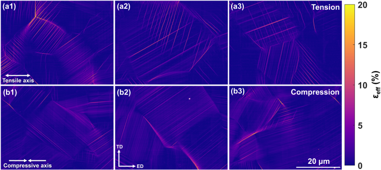 图1 有效剪切应变(εeff)分布图:(a1)-(a3) 拉伸;(b1)-(b3) 压缩。该图清楚地展示出压缩变形过程中应变分布更弥散。
