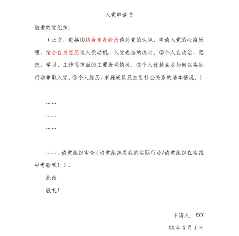 3.正文。主要内容包括:①本人对党的认识,包括党的性质、宗旨、基本纲领、基本理论、基本路线、党的历史以及自己对党的认识的变化过程。 ②入党动机和对入党的态度。表明自己的入党愿望; ③个人政治、思想、学习、工作、作风等方面的主要表现情况;④今后的努力方向以及如何以实际行动积极争取早日入党。⑤个人的履历、家庭成员和主要社会关系情况。