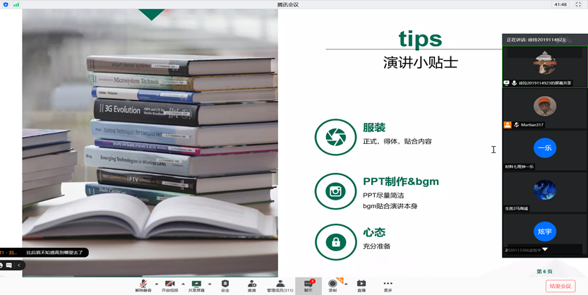 演讲与口才协会于9月20日15:00-16:00通过腾讯会议平台开展了演讲与口才基本技巧的培训活动。活动由年级助理李子浩同学主持。