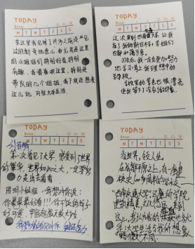 在头脑风暴环节,为鼓励中学生们开拓思维、踊跃参与,材料学院的小伙伴们精心准备了交大书签、校徽、中性笔等精美小礼品,并提供了便签帖以便写下感想。刘百舸同学说道:“周玥学姐,我要为能够见到你,继续努力。”孩子们的真挚话语,驱散了大学生们的疲惫与辛劳。一位家住犀浦曾在石羊初中工作过的资深退休教师也闻讯来到现场,与中学生亲切交流,谆谆教诲,寄予厚望,鼓励他们早树目标,刻苦学习,不断努力,未来报效祖国,服务民众。