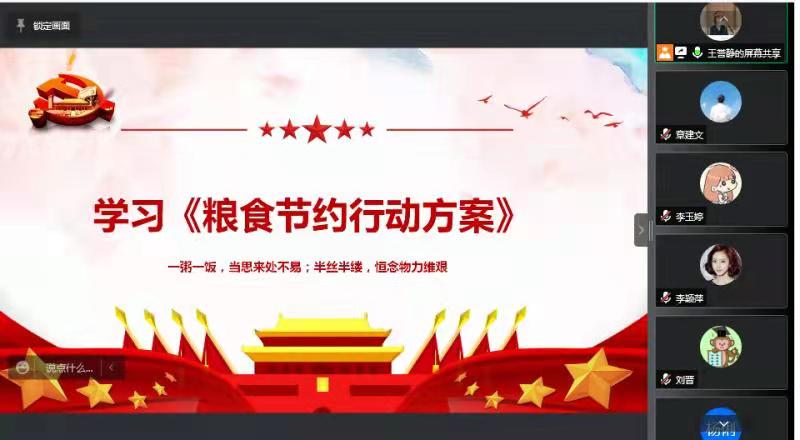 活动的第一个环节,由支部书记王誉静同志带领大家一起学习了《粮食节约行动方案》,积极响应学院党委、纪委的倡议,明确要求各位党员同志要牢固树立勤俭节约意识,日常就餐做到光盘行动,思想上重视,行动上落实,为做好粮食减损做出我们个人最大的努力,并积极带动身边人响应号召,做爱粮节粮的倡导者、践行者、宣传者、表率者,做节粮行动精神的学习者。