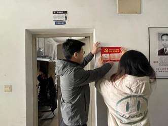 本科生第一党支部书记熊苏雅,第二党支部书记郑纪伟,辅导员邓文婷,学生党员张斯涵、于睿智、颜阳、王晓婷等同志,前往园区为学生党员挂牌。熊苏雅和郑纪伟老师提醒党员同志要牢记入党初心,做好老师与学生之间沟通的桥梁作用,用实际行动践行服务集体。前来挂牌的师生还为新同志佩戴党徽。