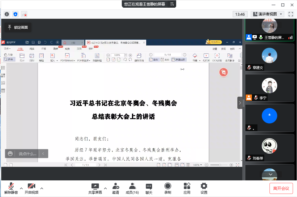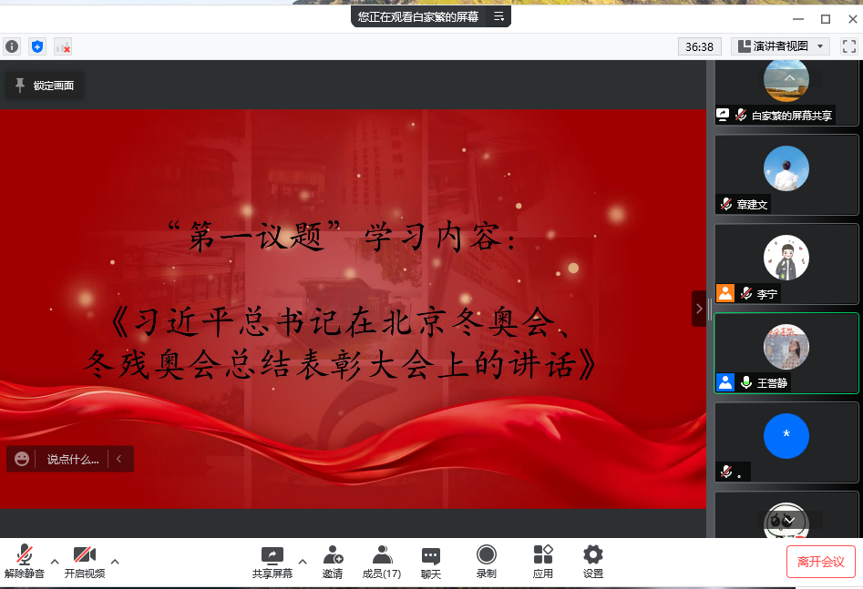 研究生第十党支部在主题党日活动开始前,严格落实“第一议题”制度,由王誉静同志带领全体党员学习了《习近平总书记在北京冬奥会、冬残奥会总结表彰大会上的讲话》,通过对讲话精神的学习,积极引导青年学生、党员同志更加紧密的团结在党中央周围,发扬北京冬奥精神,以更加坚定的自信、更加坚决的勇气,向着实现第二个百年奋斗目标奋勇前进,向着实现中华民族伟大复兴的中国梦奋勇前进。同时向全体成员明确提出要求,号召全体与会同志、同学加强自身锻炼,增强身体素质,以更好的精神面貌投入到科研学习中。