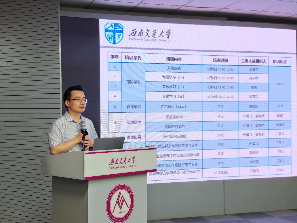 章春军主持开班仪式,介绍本次培训班主要包括理论学习、影视学习、实地研学、集中研讨学习和素质拓展五个部分,强调支部书记们要认真参与培训,有效解决好实际工作痛点、难点,争做一名合格的党支部书记。随后陈勇讲话指出,本次培训活动内容充实、全方面开展学习,希望大家要高质量、高效率完成培训,增进工作交流,重视党的理论学习,强化学习意识,坚持深入学习,创造“想干、肯干、会干”的工作氛围,增强党支部工作活力,并宣布学院党支部书记培训班正式开班。