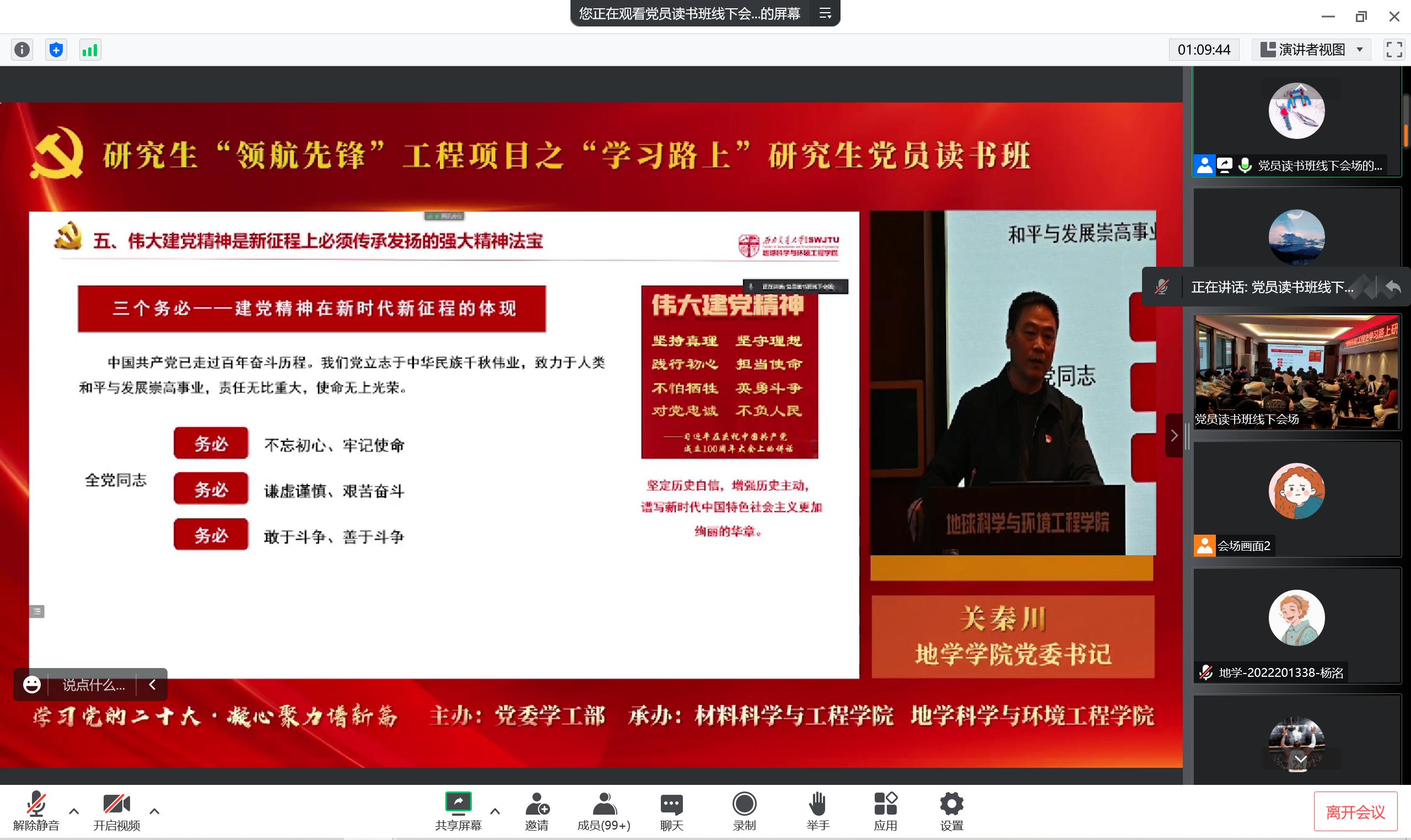 党委以线上线下结合的方式共同开展“学习二十大·启航新征程”研究生党员读书班讲座。本次讲座由地学学院党委书记关秦川主讲,地学学院学生党建负责人文强主持,地学学院研究生党员代表于X4520线下学习,色情文学