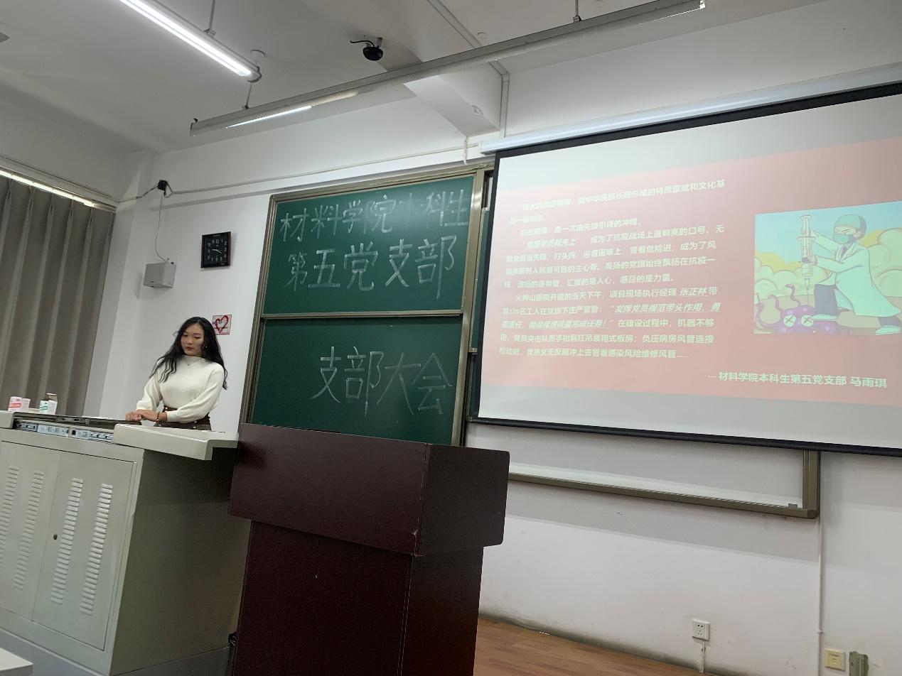 最后,学院党委副书记熊钰同志进行了总结讲话,她首先对第五党支部同志们的分享表示肯定,表示同志们要深刻体会“人民至上,生命至上”的意义,并指出要从党的指导思想、马克思主义中国化、时代化的角度深刻理解伟大抗疫精神的内涵,鼓励同志们通过实践锻炼,不断提高自身素质。