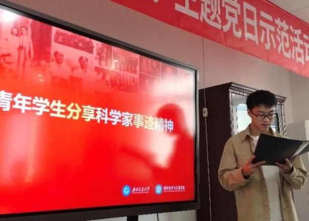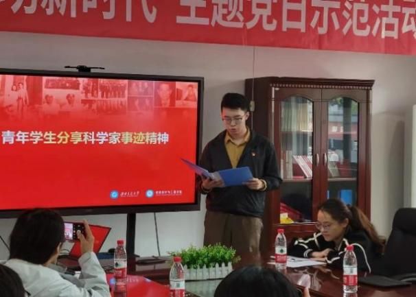来自学院本科生第一、三党支部的学生代表分享党的二十大代表中的科学家风采。孙熙桐同学分享了致力于乡村振兴、科技扶贫的“农民院士”朱有勇的故事,他表示作为新时代青年,要在科创中增强问题意识,看到质朴问题中的大学问,始终不忘作为新时代青年的责任和担当,像朱有勇院士一样,把论文写在祖国大地上,把科研做到人民的心中。谭子玲同学分享了长期从事生物防御新型疫苗和生物新药研究并具有卓越贡献的陈薇院士,她表示陈薇院士的工作和成就激励我们要勇敢追求自己的梦想,勇敢迈向未知。她展示了热情与勇气能够改变世界,不论梦想有多大,只要有决心,也可以成为改变世界的力量。陈文博同学分享了在激光化学基础研究上,作出了系统性、创造性的贡献的沙国河院士,他呼吁大家学习沙国河院士,以兴趣为引,以责任为纲,始终不忘作为新时代青年的责任和担当,将自己学习的知识和锻炼出来的技能,回馈社会、服务人民。马俊涛同学分享了一生淡泊名利,甘于奉献,从不计较个人得失的宋宝瑞先生,他认为,我们应学习宋宝瑞先生的爱国情怀与责任感,用自己的专业知识解决人民的问题,满足人民的期盼,像宋宝瑞先生一样,以共产党员的政治站位为人民谋福利,为人民谋幸福,将人民群众的心和党紧密相连。