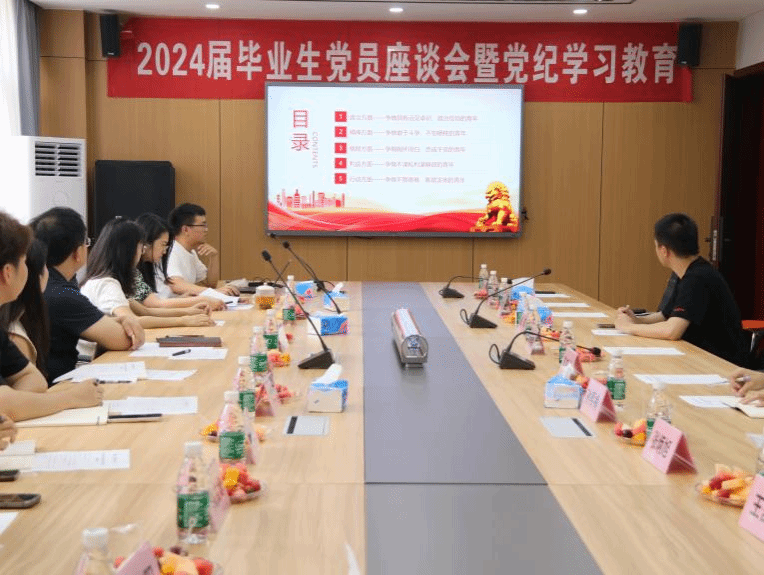 于九里校区3号教学楼3310会议室开展2024届毕业生党员座谈会暨党纪学习教育主题党课。学院党委书记张占军、组织员严翼飞,辅导员代表及毕业生党员代表参加此次座谈会,会议由严翼飞主持。