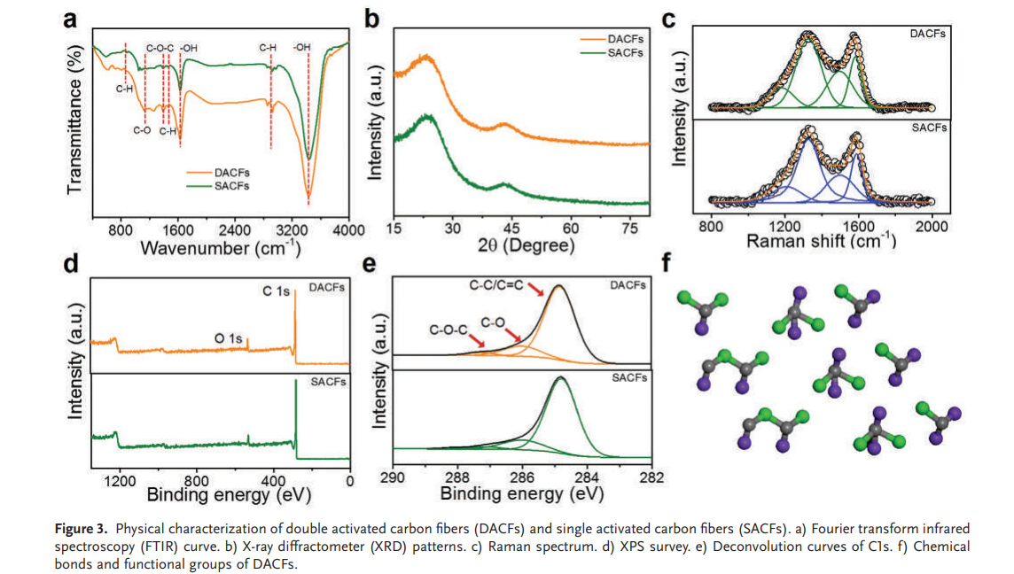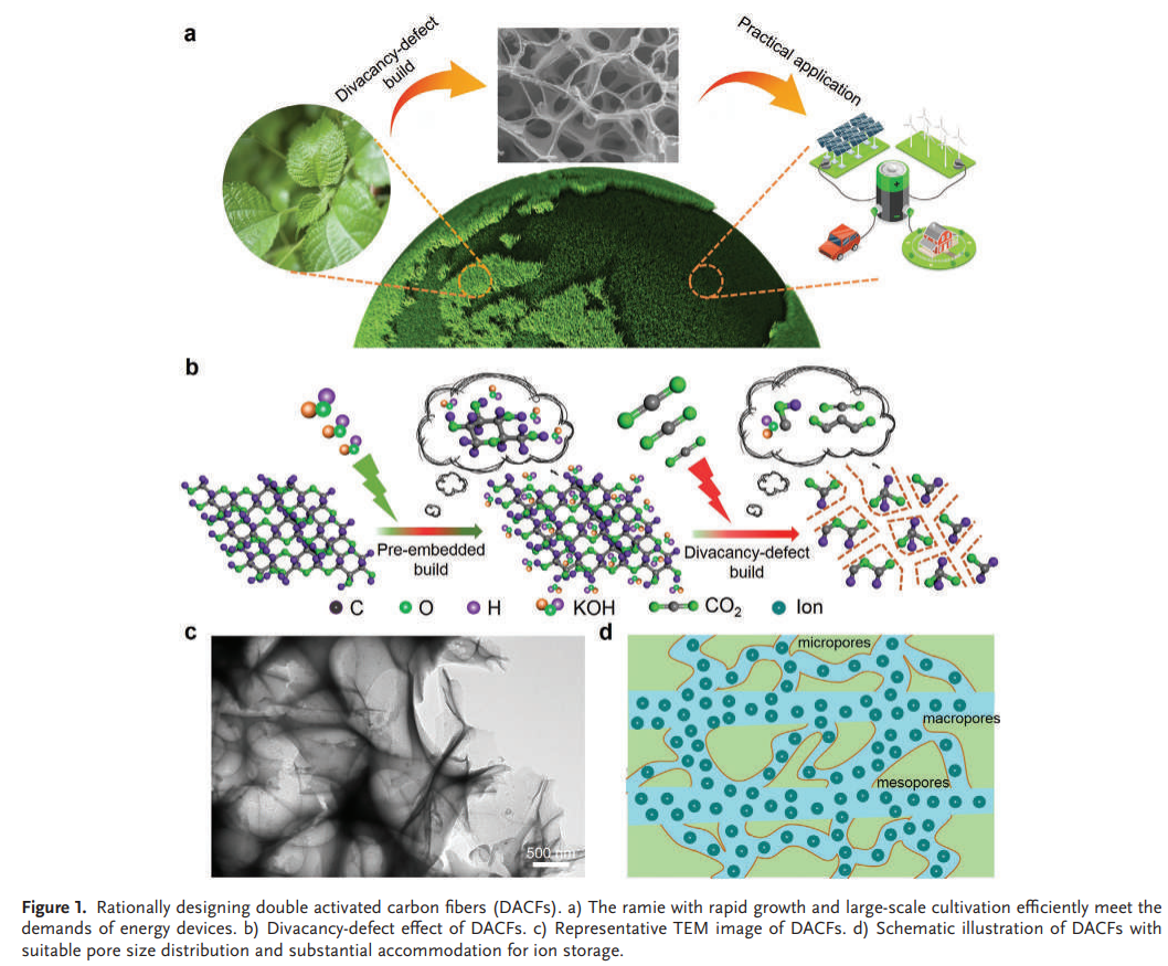Rencently, a excellent work by Prof. Yang Weiqing, Zhang Haitao and Liu Yan have been pubilished at famous academic journal Advanced Functional Materials (IF=16.836). Here, a hierarchically divacancy defect building platform is reported for effectively biomass-transferred and highly interconnected 3D dual-activated porous carbon fibers (DACFs) based on the internal−external dual-activation function of the pre-embedded KOH and CO2 molecular. This uniquely interconnected frameworks not only fully provide the abundant active sites for ion interaction, but also efficiently guarantee the substantial accommodation for ion storage. Based on this, the as-prepared DACFs-based supercapacitors deliver a high energy density of 61.3 Wh kg−1 at a power density of 875 W kg−1 in the EMIMBF4 ionic liquid. This work not only provides a simple and efficient technique to enhance the energy density of carbon materials, but also probably promotes its additional application in environmental remediation.