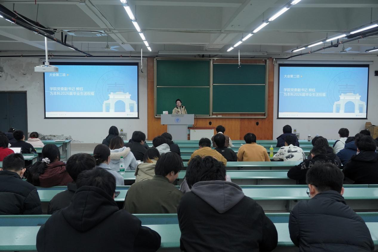 最后,张琬祺围绕毕业相关事项进行重点提醒:一是严守考试纪律,诚信应考,坚决杜绝作弊、无故缺考等行为;二是重视毕业资格审核,查缺补漏,确保顺利毕业;三是强化安全意识,持续防范网络电信诈骗,严格禁用违章电器,规范校外住宿管理,外出及时履行报备手续,切实保障个人人身与财产安全。