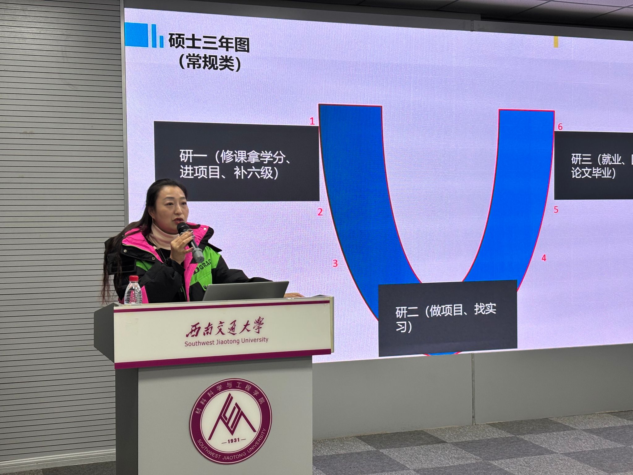 杨子仪老师详细阐述了研究生阶段的特殊性,强调了制定合理学习计划的重要性。她提到,研究生期间应当将理论学习与实践锻炼相结合,积极参与科研项目或社会实践,以此提升自身竞争力。同时,他还特别提到了实习对于研究生的重要性,鼓励大家利用空余时间积极寻找与专业相关的工作机会,积累实际工作经验,以便毕业后能够更快地适应职场需求。此外,杨子仪通过“U形图”向同学们详细介绍了研究生期间每一个阶段的重要任务,引导同学们如何通过有效时间管理和目标设定实现个人发展目标,提醒同学们避免因缺乏准备而错失机会。在谈到如何确定个人发展方向时,杨老师建议研究生们可以从兴趣爱好、能力特长以及市场需求三个方面综合考虑,结合自身的实际情况做出最适宜的选择。此外,他还分享了一些实用技巧,如建立人脉网络、参加行业论坛等,这些都是帮助研究生拓展职业选择的有效途径。