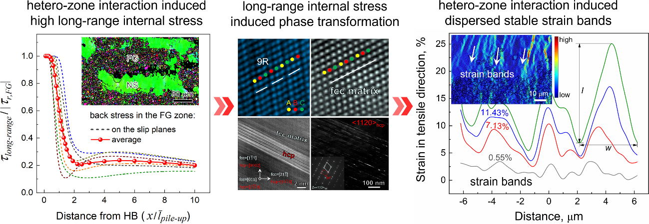 由于异质区边界处强烈的位错塞积于而产生的长程内应力积累,从而显著提高了屈服强度。在塑性阶段,高的内应力有助于激活软域(细晶区)的相变,而区间约束导致在硬域(纳米结构区)形成分散的稳定应变带。这些额外的机制连同增强的形变孪晶,促进了加工硬化,并协调了区域之间的应变分配,从而提高了高流动应力下的塑性。这些发现表明了异质结构设计的一个原则:引入强异质区间相互作用来增强长程内应力,从而调用新的变形机制。