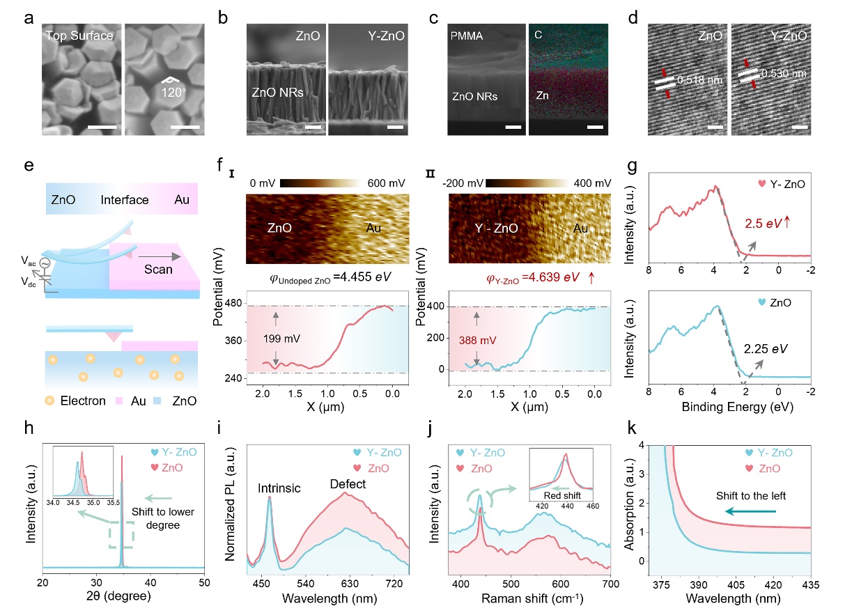 图2.未掺杂ZnO(左)和Y-ZnO(右)的横截面(a)和纵截面(b)扫描图像。比例尺为100 nm。(c) BPS的横截面EDS光谱。(d) ZnO和Y-ZnO NRs的HRTEM图像。比例尺为0.5 nm。(e) KPFM测量表面电位的示意图。(f) 未掺杂ZnO-Au(I)和Y-ZnO-Au(Ⅱ)的表面电势分布比较。(g) ZnO和Y-ZnO NRs的VB-XPS、(h) XRD图谱、(i) 室温PL光谱、(j) 拉曼光谱和 (k)紫外-可见吸收光谱。