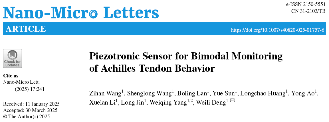 相关研究成果以“Piezotronic Sensor for Bimodal Monitoring of Achilles Tendon Behavior”为题发表于国际知名期刊《Nano-Micro Letters》(中科院一区,IF:31.6)。色情文学