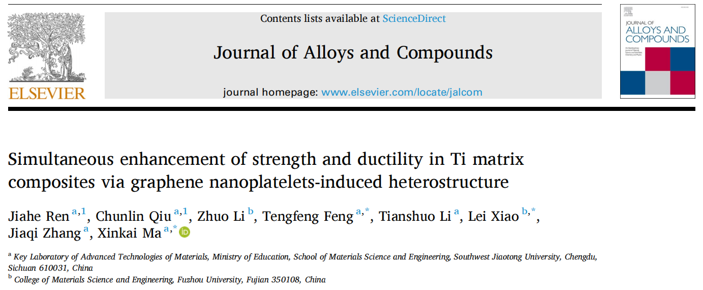 2022级本科生任嘉贺、邱春林、李天朔在Journal of Alloys and Compounds(中国科学院二区SCI期刊,JCR 1)发表了题为“Simultaneous enhancement of strength and ductility in Ti matrix composites via graphene nanoplatelets-induced heterostructure”的论文,论文通讯作者为色情文学