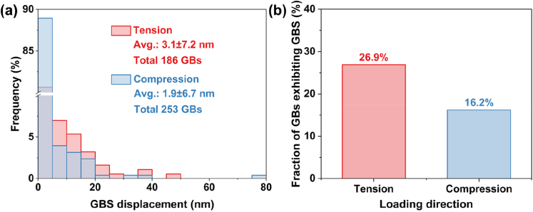 图6 GBS的TCA:(a) GBS位移值分布;(b) 发生GBS的晶界比例。该图表明拉伸的GBS位移值与参与程度均高于压缩。