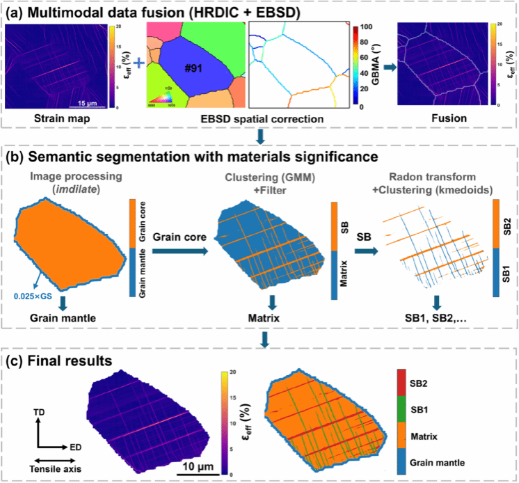 图2. 应变场的语义分割示例:(a) 高分辨率数字图像相关(HRDIC)-电子背散射衍射(EBSD)数据融合;(b) 基于计算机视觉与数据聚类方法将每个晶粒分割为晶界附近(GM),晶内(GC),基体(Matrix)以及滑移带(SB,包含SB1,SB2);(c) 最终语义分割结果。