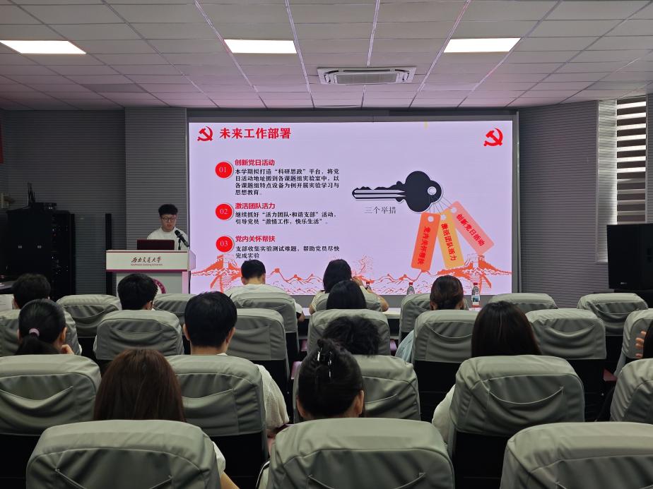 会议严格按照议程进行。第一项,集体学习习近平总书记在纪念中国人民抗日战争暨世界反法西斯战争胜利80周年大会上的重要讲话精神。党员闫欣月同志带领大家回顾了波澜壮阔的抗战历史,重温了阅兵仪式的深刻意义,并深入解读了伟大抗战精神的时代价值与现实启示。她结合近期国际形势,强调了铭记历史、捍卫真相的极端重要性,号召大家作为新时代的研究生党员,必须将抗战精神传承好、弘扬好,将其转化为攻坚克难、科研报国的强大动力。