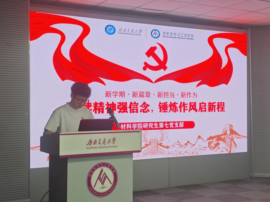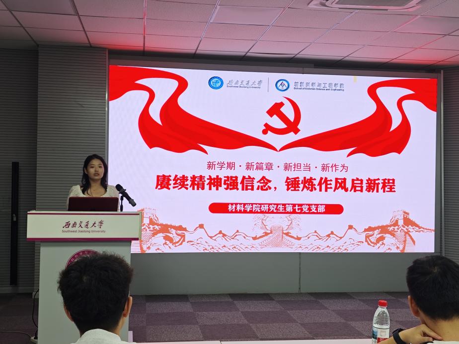 研究生第七党支部在九里校区3号楼3324会议室,组织召开新学期第一次主题党日活动。本次活动的主题为“赓续精神强信念,锤炼作风启新程”。学院团委书记王誉静、党建负责人张宝开等老师莅临指导。支部全体党员、部分入党积极分子及入党申请人共同参加。活动由党支部书记邰浩云主持。